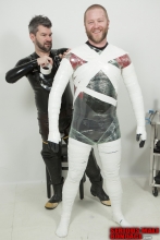 This is an old video from the archives in the 4x3 screen size. Rubber men enjoy doning multiple layers of skin-tight material which provides them with an intense cocooning experience. In this video Rank applies ten layers of material to his test gimp: neck-entry latex catsuit, neoprene wetsuit, pallet wrap, white duct tape, another neoprene wetsuit, pallet wrap, red duct tape, Aquala rubber dry suit, rubber boots-chest waders, and a rubber motorcycle jacket. Unbelieveable! Needless to say the gimp was barely able to move let alone extract himself from the layers. What an extreme cocooning experience!