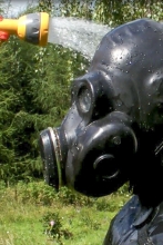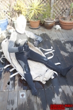This update features some images and a few short video clips of our friend Felix at home in his back yard. Felix enjoys wearing heavy rubber and tries to incprporate it in his daily life as much as he can. In this case he is mowing the grass while in rubber - but somehow he got tied up and squirted with the garden hose along the way. Poor guy!