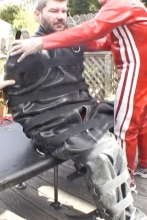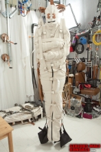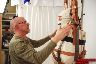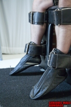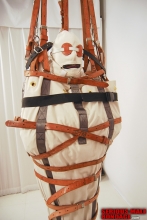 Maxcita makes the absolute best institutional and recreational strait jackets in the world. The company is a one man show because Max is a bit of a perfectionist and frankly a bit of a grump. These qualities are endearing and produce a very high quality product. Max is a true bondage fetishist that I respect a great deal. The long awaited delivery was here! Our friend had been measured for a Psyco strait jacket and leg boot. He is a large man but I had no hesitation about suspending him by the jacket. I think our friend was very happy with purchase.