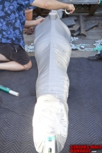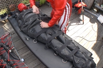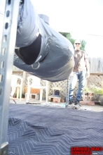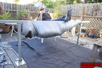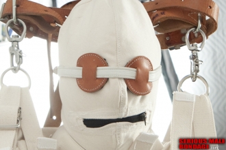 Mister X is a good friend of mine and one of my favorite people to tie up. He is really into heavy bondage and always wants to do something special. It was his birthday but I knew exactly what he wanted. We have some new Maxcita gear that is sized for a larger man so we thought we could put on a few layers. The first layer was a one piece leg sleeve and strait jacket. The second layer was another strait jacket. The third layer was another strait jacket and leg sleeve. The fourth layer was a large mail sack. Throw in a hood and twenty or so Humane Restraint straps and you have a bondage lover party. Happy Birthday Mister X! If you want to know his age, you will have to ask him. However, pound for pound this guy loves his heavy bondage and can endure some pretty strenuous positions.